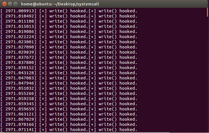 من از طریق system call table سیستم کال __NR_write هوک کردم و تابع ای که جایگزین کردم فقط یه printk معمولی هست وقتی ماژولمو اجرا میکنم، dmesg که میخونم پشت سر هم مثل یه لوپ تابع جایگزینم که یه printk هست اجرا میشه:
