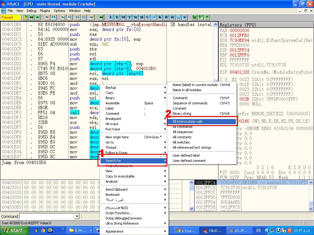در اینجا باید بعد از لود کردن برنامه داخل OllyDbg ، بر روی فرم اصلی راست کلیک کرده و گزینه Search For و سپس گزینه All InterModuler Call رو انتخاب کنید.