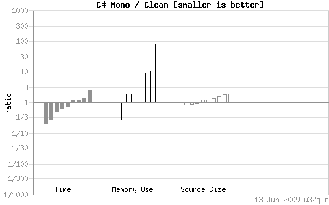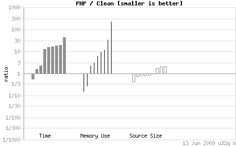 آمارهای زیر از سایت معتبر shootout.alioth.debian.org گرفته شده است. این آمارها نحوه اجرای همان کد را بر روی سیستم عامل لینوکسی برای هردو زبان نشان میدهد: